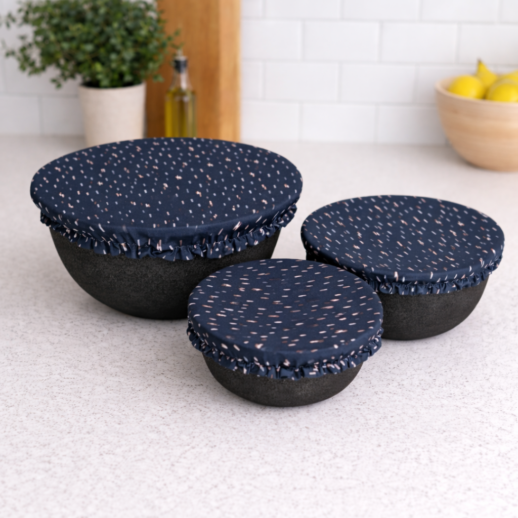 Small changes = Big Impact. Pop a reusable bowl cover on to keep leftovers fresh or sticky fingers out of your bread dough and cookie batter. The PUL lining ensures moisture stays in and the elastic enables you to use it on a variety of sizes with ease. Colibri Bowl Covers help keep food fresh while reducing single use plastics.